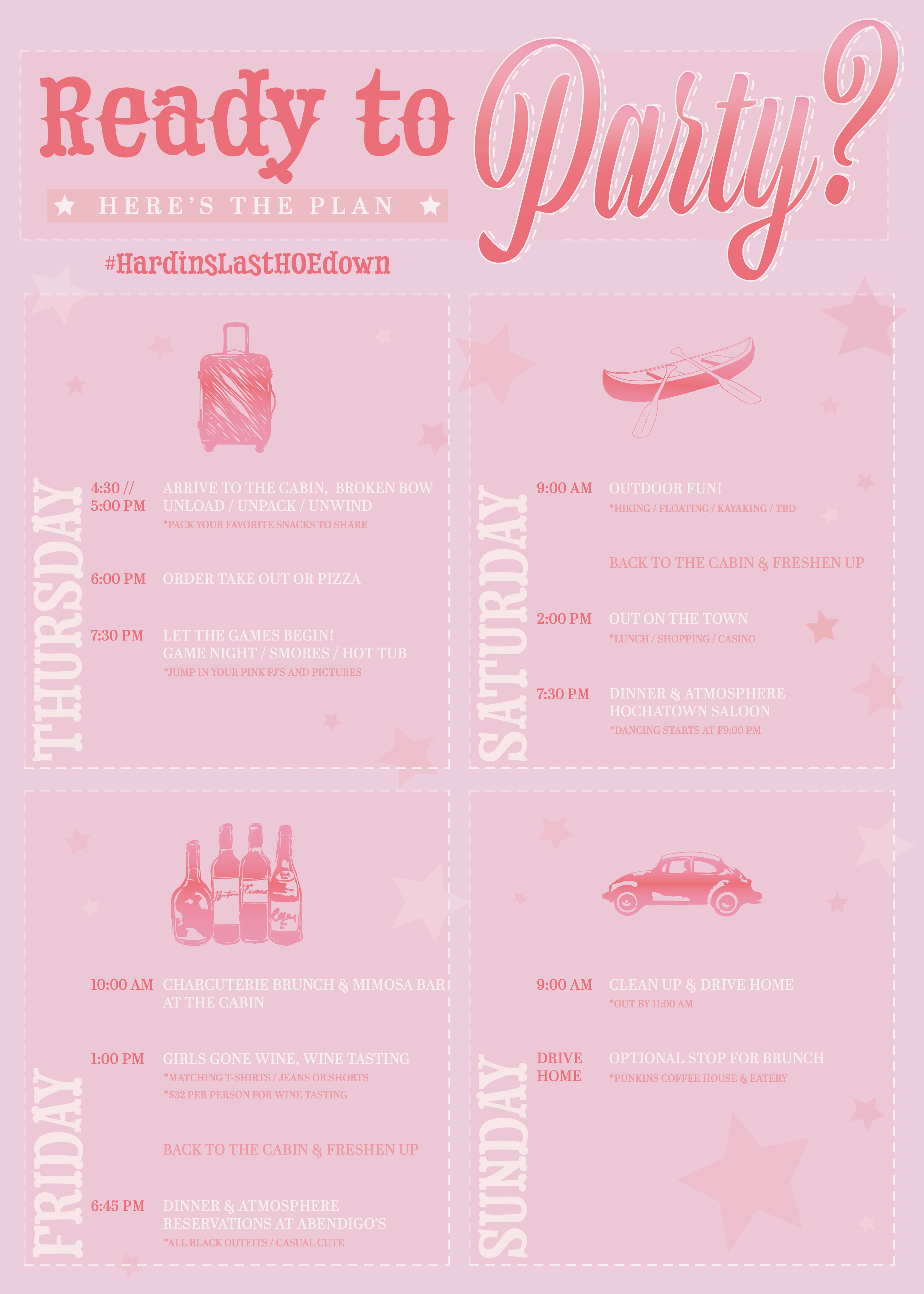 The following is a series created for a bride for her bachelorette party. The bride was wanting to use a trendy “Let’s Go Girls” theme but wanted a design that would be unique to her and her bridesmaids. This is the final design we came up with together.